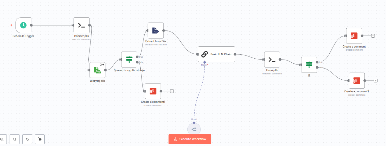 Wyszło coś takiego jak poniżej. Dodam tylko, że workflow dodatkowo wykorzystuje 2 skrypty bashowe uruchamiane lokalnie na serwerze domowym. Konieczne również było utworzenie dodatkowego wolumenu na pliki.